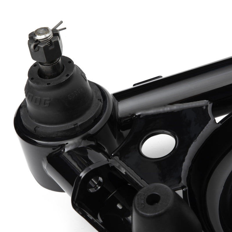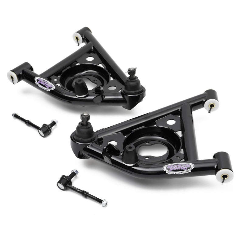 S10 platforms. Features include a robust tubular design with gussets and cross brace, Delrin™ bushings with steel housings and crush tubes, and a black powder coated finish. The geometry features include additional positive caster in the 1978-1988 G-Body and 1982-2003 S10 control arms compared to stock. Any OEM shock and spring package will fit. These tubular lower control arms are shipped complete with lower ball joints, steering stops, and are ready to install on your car. Also included with the control arms are the heavy duty precision end links that connect the lower control arms to the front sway bar. The lower control arms have CNC machined tube ends for precision fits. The arms are then TIG welded in a fixture for accuracy and repeatability of geometry. Optimize your performance with a Detroit Speed shock or spring package.