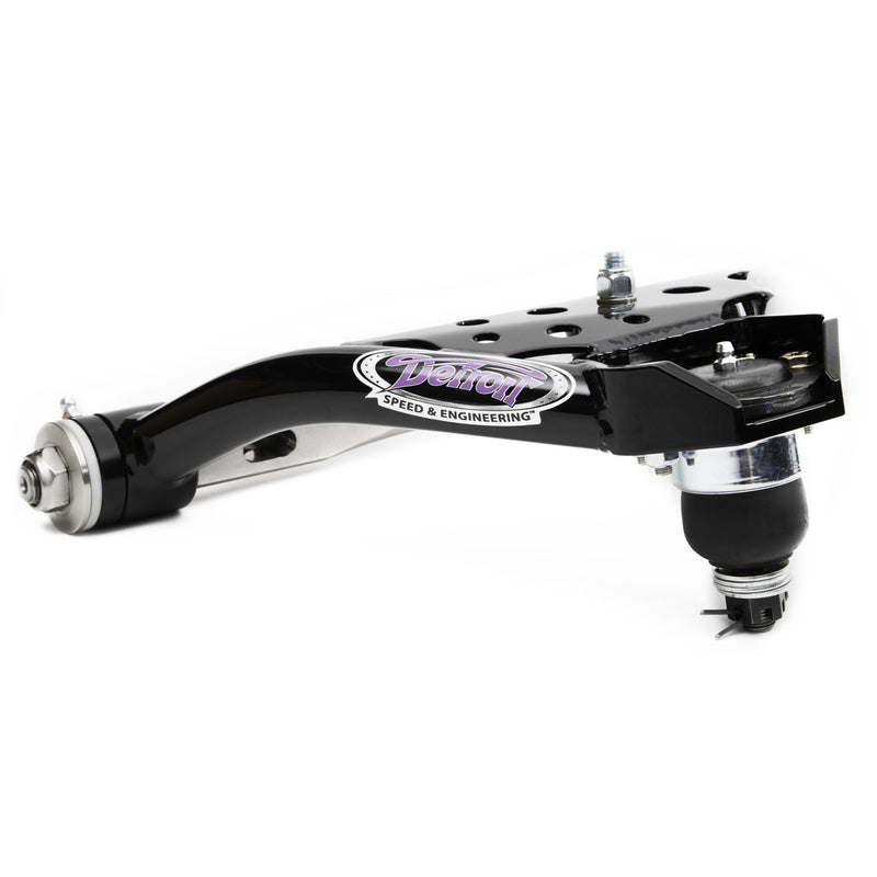 The Detroit Speed, Inc. upper control arm kit is a complete and comprehensive package. Detroit Speed has done all the engineering and testing, and supplies all parts needed to complete the installation. All you will need to do is follow the instructions and supply the grease. Installation should take less than one day and should be followed by a professional alignment Detroit Speed's upper control arm kit is a bolt on enhancement for 1978-1988 G-Body and 1982-2003 S10 platforms. Suspension geometry is improved over stock by increasing camber gain and improving roll camber. Detroit Speed's upper control arms have been computer modeled and the components have undergone finite element analysis. The control arms have CNC stainless steel cross shafts which incorporate our 'Caster Tuner Bushings'. These aluminum bushings adjust caster by moving the upper control arm fore/aft for more or less caster without adding alignment shims. This unique caster adjustment design is engineered to be precise and permanent. The upper control arms also utilize Detroit Speed designed bushings. These greaseable aluminum/Delrin™ bushings have an increased stiffness over stock. This provides more consistent and precise handling. The bushings also have CNC machined bevel stainless washers and stainless nylock nuts. The upper control arms have CNC machined tube ends for precision fits. The arms are then TIG welded in a fixture for accuracy and repeatability of geometry. The ball joint pocket is CNC machined from billet for increased strength. The arms are powder coated gloss black and come assembled with ball joints. Two sets of 'Caster Tuner Bushings' are included. The Detroit Speed upper control arms are ready to bolt on!