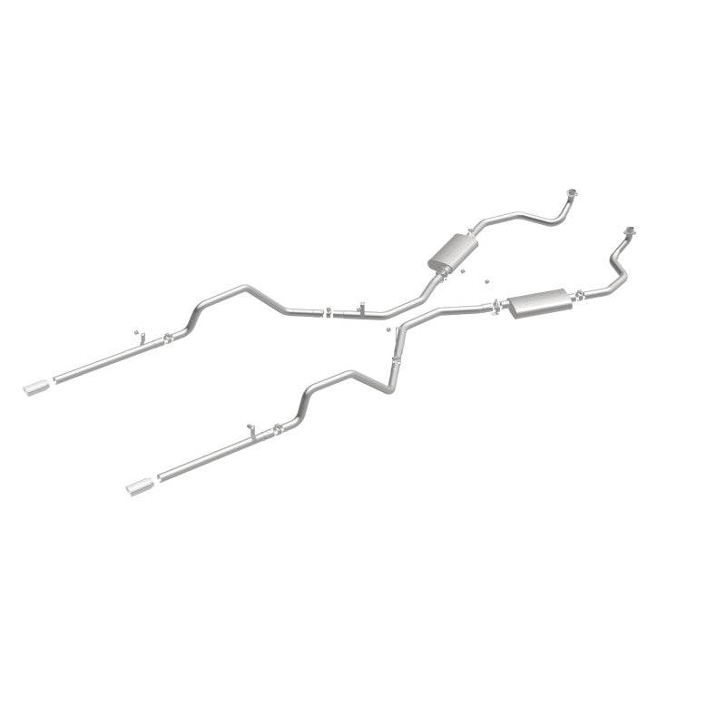 The MagnaFlow 1961-1964 Chevrolet Impala Street Series Crossmember-Back Performance Exhaust System 16724 brings enhanced engine sound and dyno-proven performance to your 3.8L, 4.6L, 5.3L, 5.4L, 5.7L, 6.7L, 7.0L 1961-1964 Chevrolet Impala with a healthy helping of our deep, resonant signature exhaust note at Moderate exterior and Mild interior sound levels. Thanks to its durable, corrosion resistant stainless steel design, this Chevrolet Impala exhaust system will handle whatever tarmac you decide to leave your mark on. This performance exhaust kit features a crossmember-back layout designed to replace your Chevrolet Impala's exhaust system from the crossmember on back. With its fast-flowing, mandrel bent 2.5in. main piping and 2 Straight-Through mufflers ending in a Dual Split Rear exit with 3in. Polished Welded-On Single Wall Angle Cut Rolled Edge tips, your muscle car will be sounding as awesome as it looks. Extensive 3D scanning during development has resulted in a direct-fit design that you can easily install yourself. 16724 is produced using CNC precision robotic manufacturing techniques and is backed by MagnaFlow's limited lifetime construction warranty.