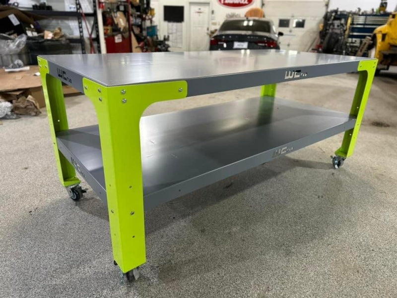 Set of 4, 34 inch tall, 11 ga. Steel Legs in Custom Powder Coat Color of your Choice for use with WCFab Modular Steel Work Bench Top and Shelf. Includes installation hardware.